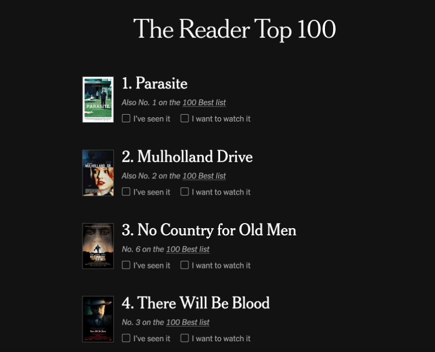 Now, the NYT has published a new list based on the opinion of more than 200,000 readers who have voted for their favorite movies.
