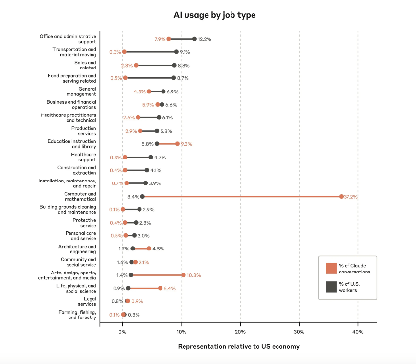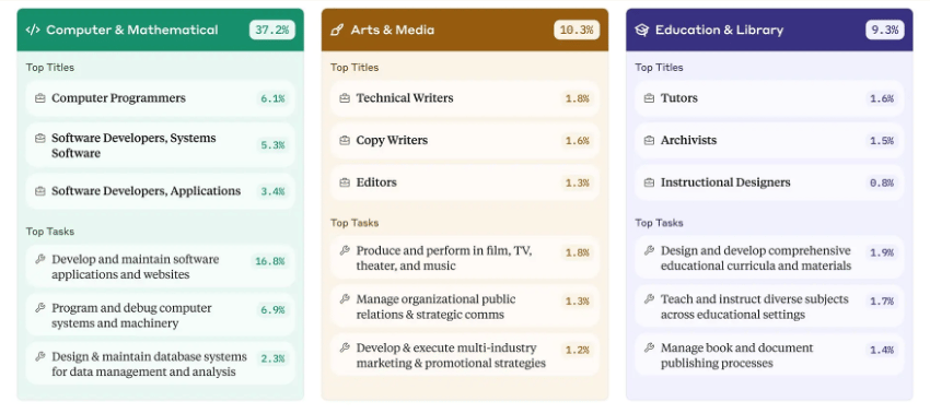 On this page some of the first data analyzed and published by this new index are available. For example, it shows the degree of AI usage based on the type of work, or what percentage of AI-facilitated tasks lean more toward augmentation (57%) of human capabilities compared to the automation (43%) of tasks, where AI directly performs tasks.