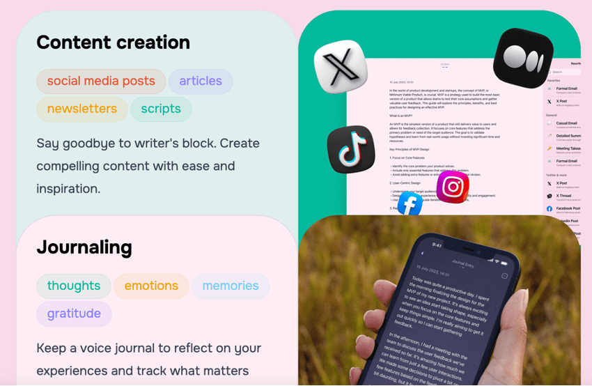 Among the use cases highlighted on Letterly's website are the following: notes (ideas, to-dos, shopping lists, plans), communication (messages, emails, comments), content creation (social media posts, articles, newsletters, scripts), and journaling.