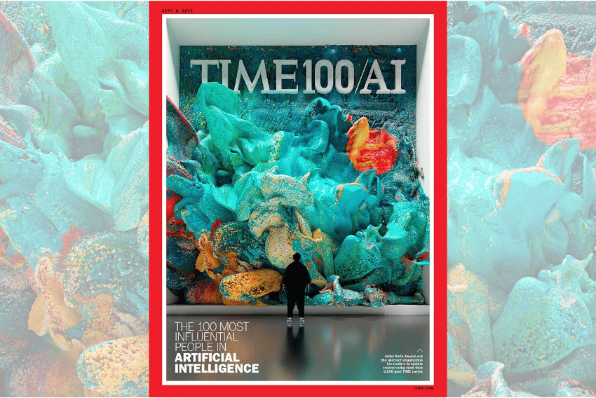 The 2025 TIME100 AI issue includes a worldwide cover, featuring a photo illustration by artist and list-maker Refik Anadol. For the cover, TIME provided Anadol with more than 5,000 past TIME covers, allowing his AI to reimagine what the cover would look like for the TIME100 AI issue. The resulting abstract visualization represents the AI “dreaming” about a century of TIME’s visual history.